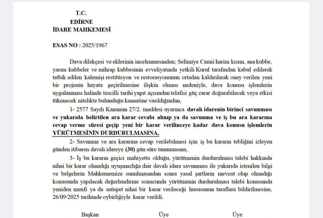UNESCO Dünya Kültür Mirası Listesi’nde yer alan ve Mimar Sinan’ın "ustalık eserim" dediği Selimiye Camii’nde restorasyon sürecinde kubbe yazılarında yapılması planlanan değişikliğe Edirne İdare Mahkemesi "dur" dedi. Mahkeme, yürütmenin durdurulmasına karar verdi. Mahkeme ayrıca kubbe yazılarında yapılmak istenen değişiklik için yürütmeyi durdurdu.
