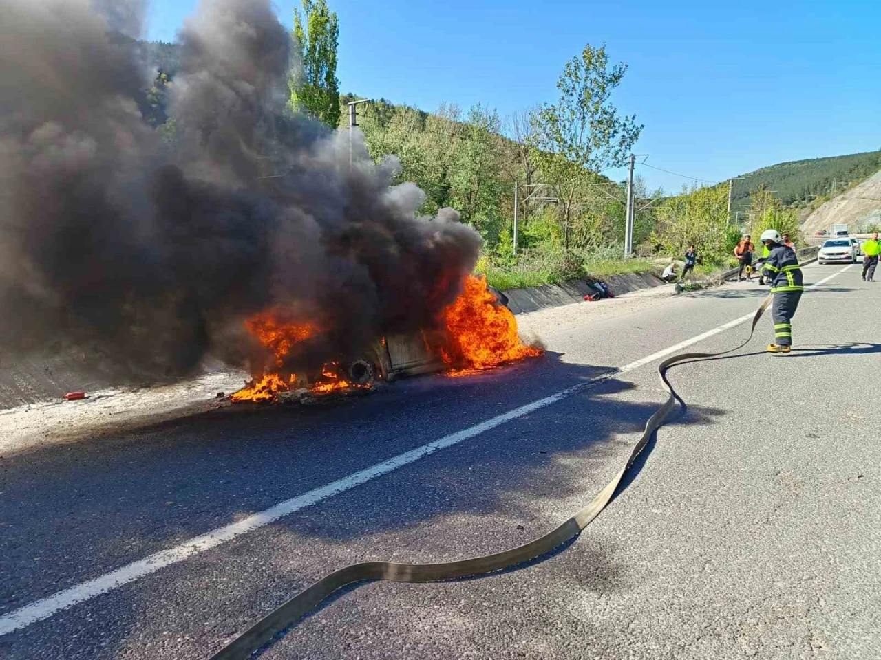 Bilecik’te seyir halinde iken bir anda alevler yükselen araç cayır cayır yandı.