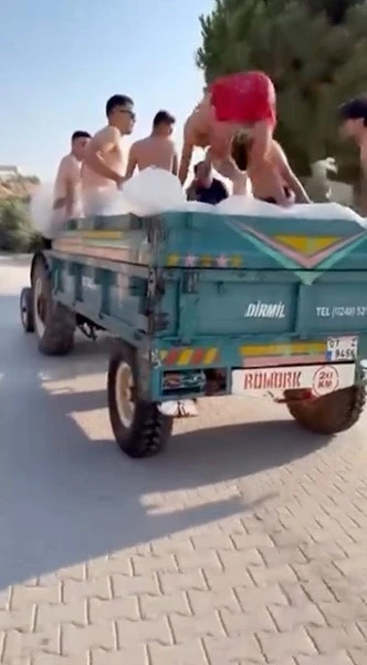 Demre’de sıcak havalardan bunalan bir grup genç, traktörün römorkunu suyla doldurup mobil havuza çevirdi ardından da şehir turu attı. Gençlerin sıcak havada tehlikeli serinliği cep telefonu kameralarına yansıdı. Görüntülerde gençlerin römork içindeki suyun keyfini çıkarırken aynı zamanda traktörle mahalle turu attığı anlar sosyal medyada hem ilgi hem de tepki gördü. Mahalle sakinlerinin şaşkın ve gülümseyen bakışları arasında geçen mobil havuz turu şans eseri kaza yaşanmadan sona erdi.