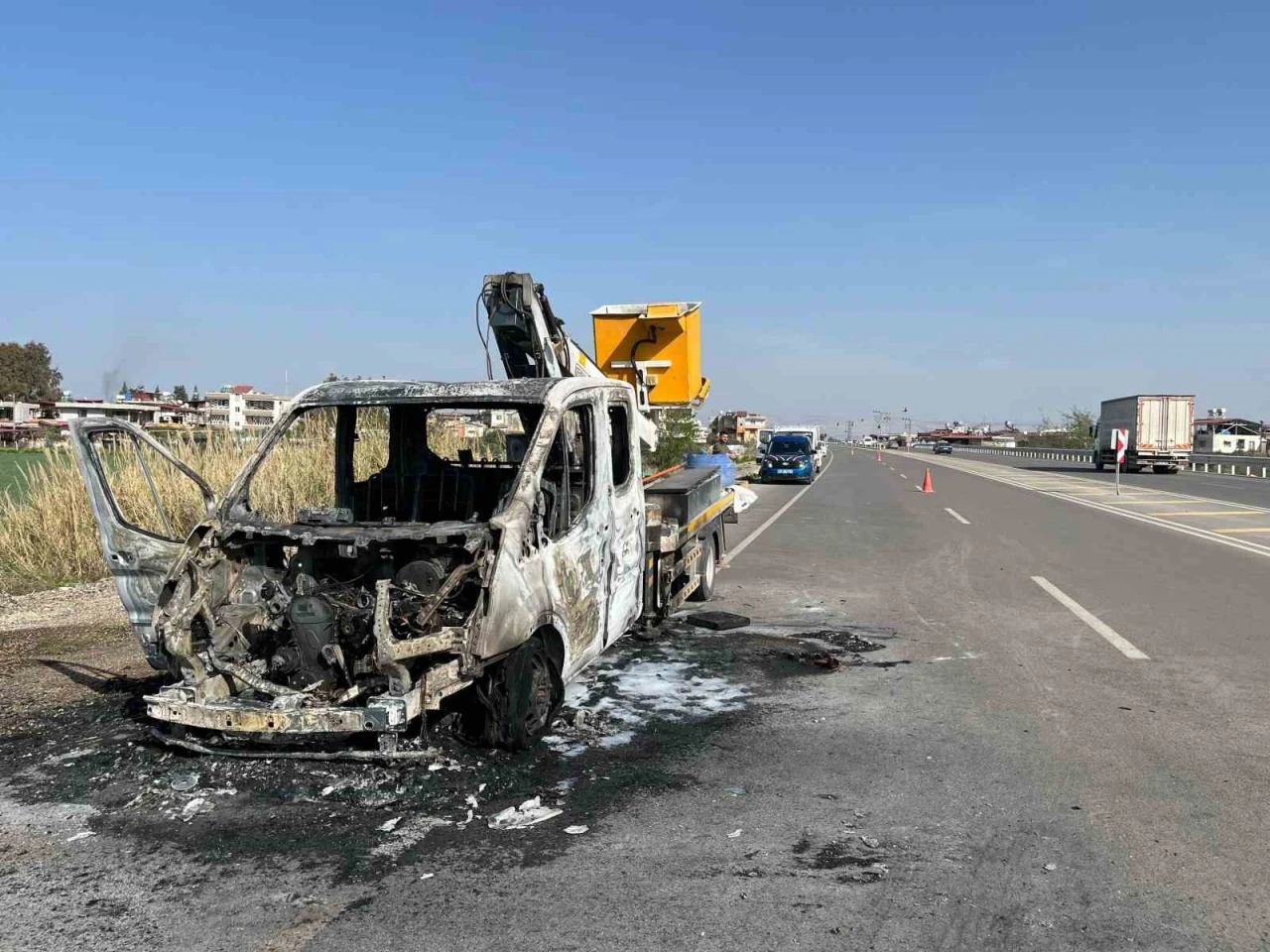 Hatay’da seyir halindeyken alevlere teslim olan vinç kullanılamaz hale geldi.