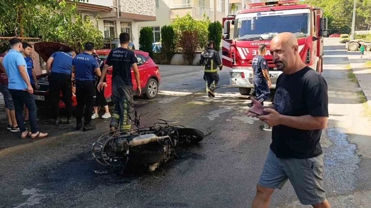 Olay yerine gelen itfaiye ekibi motosikletin tamamen sönüp sönmediğini ve yakınında bulunan araçların zarar görüp görmediğini kontrol etti.