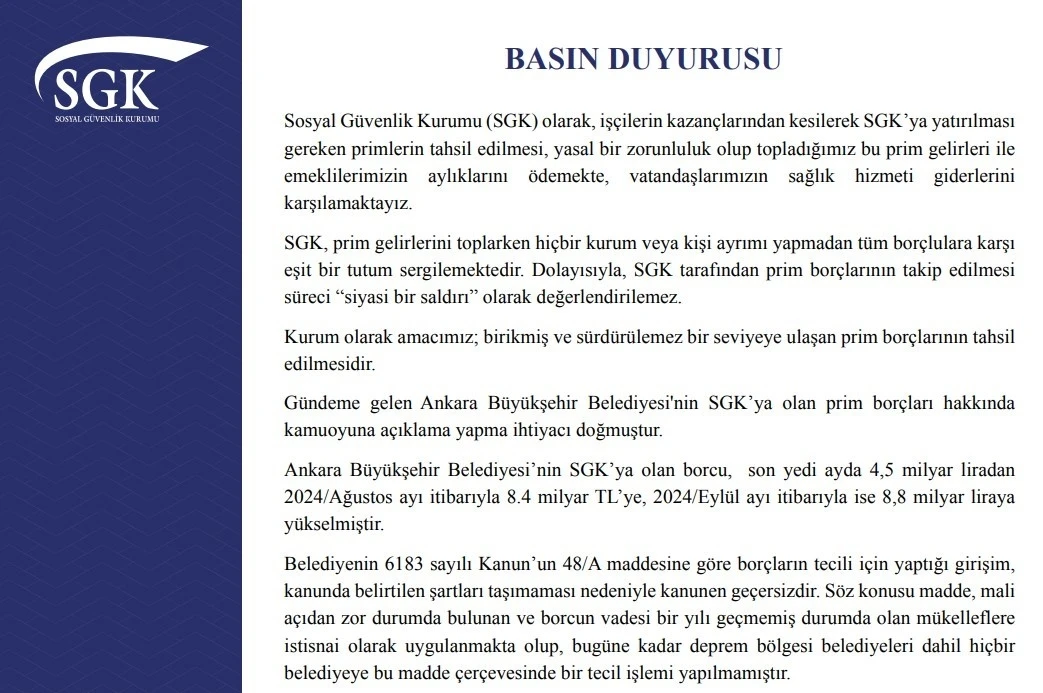SGK, Ankara Büyükşehir Belediyesi’nin prim borçlarıyla ilgili açıklama yaptı. Prim gelirleri toplarken hiçbir kurum veya kişi ayrımı yapılmadan tüm borçlulara karşı eşit bir tutum sergilendiği ve prim borçlarının takip edilmesi sürecinin ‘siyasi bir saldırı’ olarak değerlendirilemeyeceği belirtilen açıklamada, Ankara Büyükşehir Belediyesi’nin SGK’ya olan borcunun son 7 ayda 4,5 milyar liradan ağustos ayı itibarıyla 8,4 milyar liraya, eylül ayı itibarıyla ise 8,8 milyar liraya yükseldiği kaydedildi. Açıklamada şu ifadelere yer verildi: