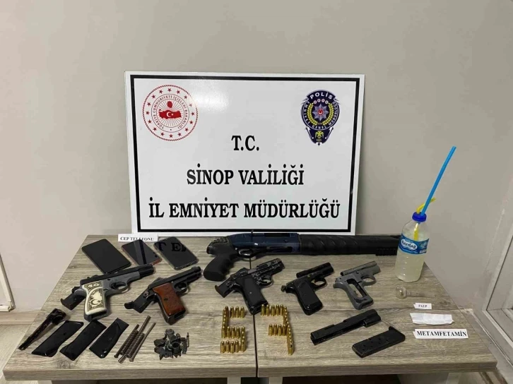 Sinop İl Emniyet Müdürlüğü Narkotik Suçlarla Mücadele Şube Müdürlüğü ekipleri tarafından şehir merkezinde gerçekleştirilen operasyonlarda; 3 adet ruhsatsız tabanca, 42 adet fişek, 25 adet muhtelif tabanca parçası, 1 adet tüfek, 0,53 gram metamfetamin maddesi ele geçirildi. Olayla ilgili 3 şüpheli şahıs yakalandı. Yakalanan şüphelilerden 1’i tutuklanarak cezaevine gönderildi.