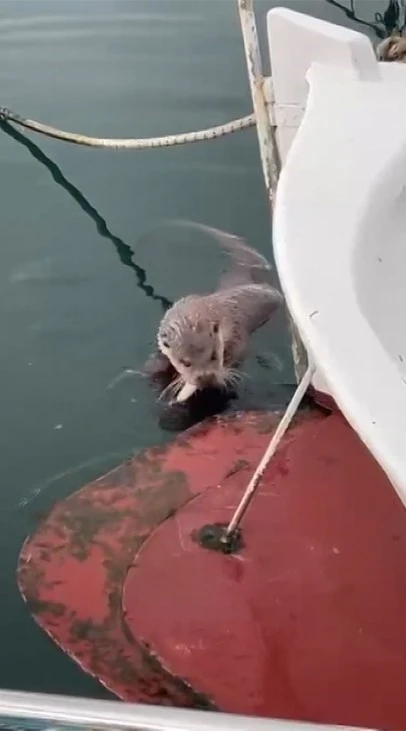 Sinop’ta kıyı balıkçılığı yapan bir vatandaş, teknesine çıkan su samurunu balık vererek besledi.