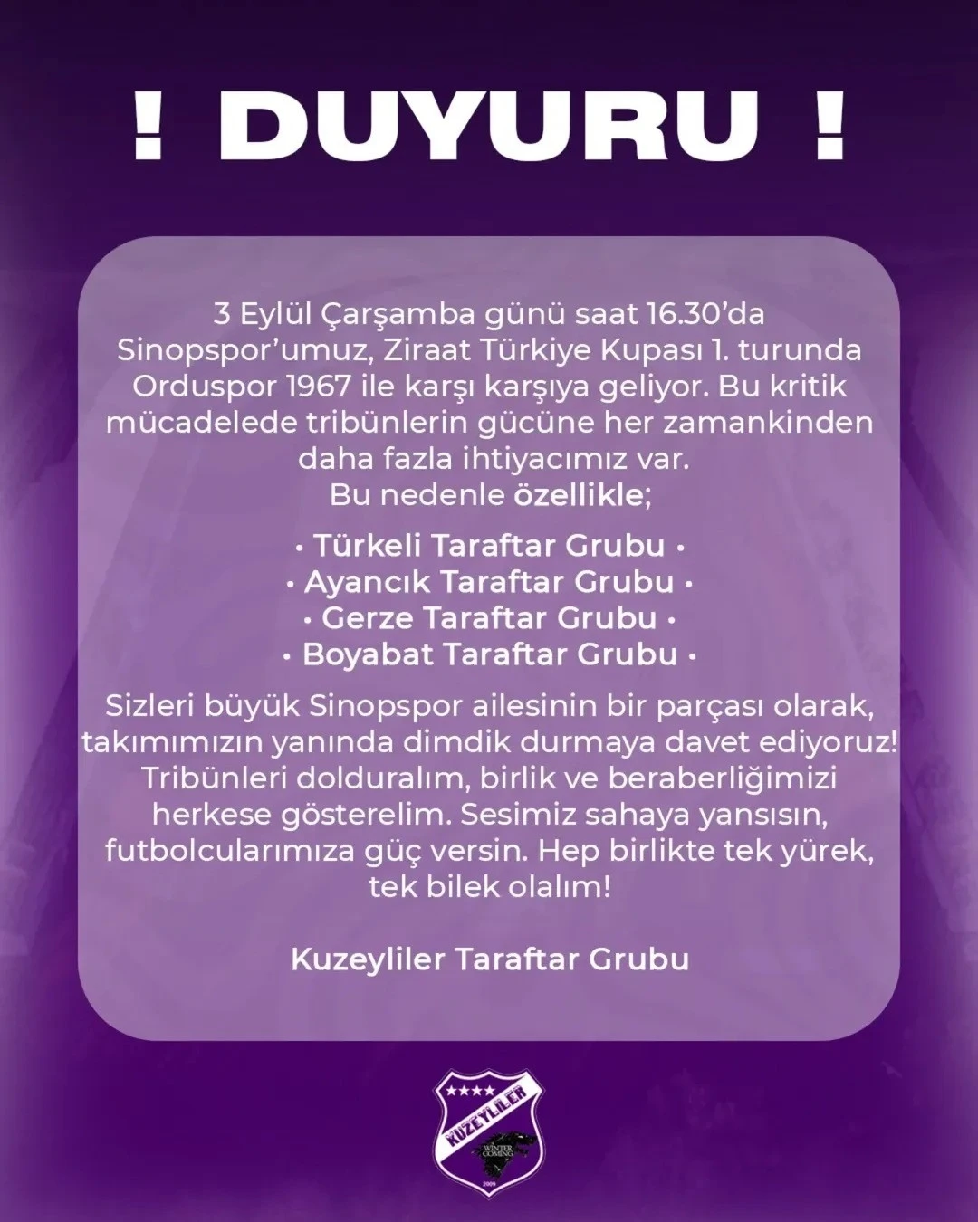 Kuzeyliler Taraftar Grubu tarafından yapılan açıklamada, "3 Eylül Çarşamba günü saat 16.30’da Sinopspor’umuz, Ziraat Türkiye Kupası 1. Turunda Orduspor 1967 ile karşı karşıya geliyor. Bu kritik mücadelede tribünlerin gücüne her zamankinden daha fazla ihtiyacımız var. Bu nedenle özellikle, Türkeli Taraftar Grubu, Ayancık Taraftar Grubu, Gerze Taraftar Grubu, Boyabat Taraftar Grubu Sizleri büyük Sinopspor ailesinin bir parçası olarak, takımımızın yanında dimdik durmaya davet ediyoruz! Tribünleri dolduralım, birlik ve beraberliğimizi herkese gösterelim. Sesimiz sahaya yansısın, futbolcularımıza güç versin. Hep birlikte tek yürek, tek bilek olalım" denildi.