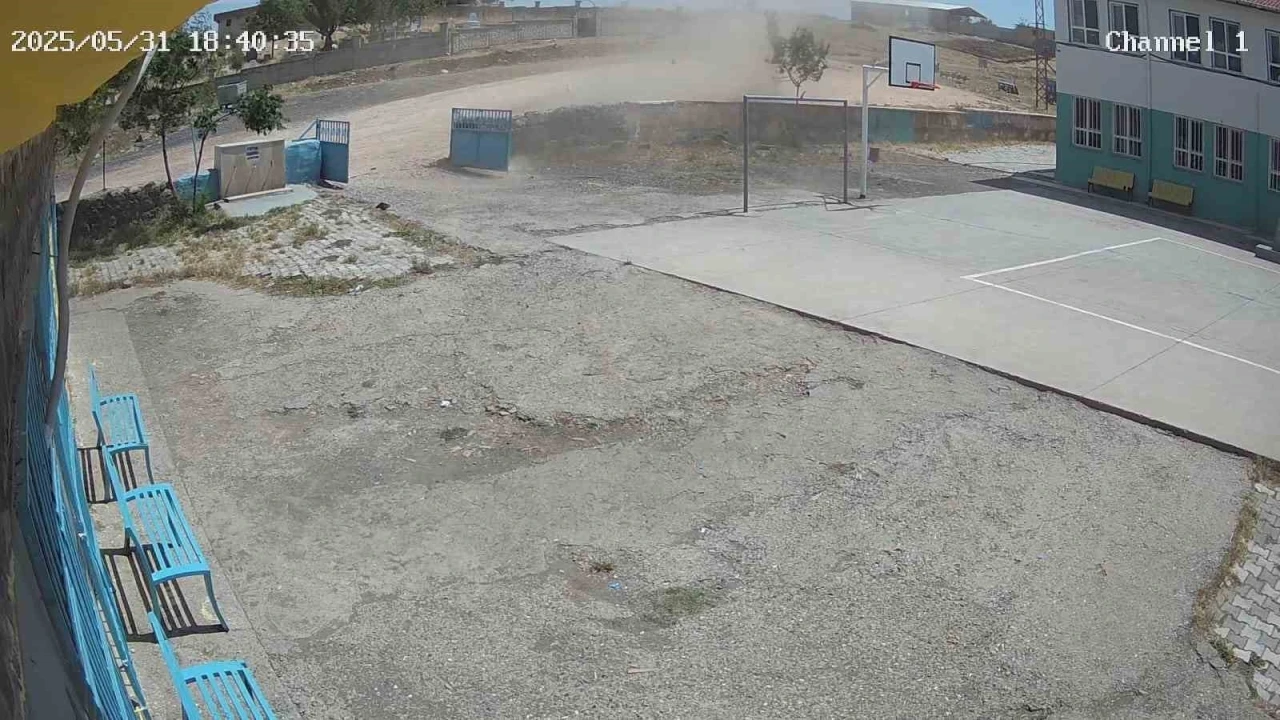 İlçeye 6 kilometre uzaklıkta bulunan Bayırözü İlkokulu ve Ortaokulu’nun bahçe kapısı, hortumun etkisiyle yerinden sökülerek kırıldı. O anlar, okulun güvenlik kamerası tarafından saniye saniye kaydedildi.