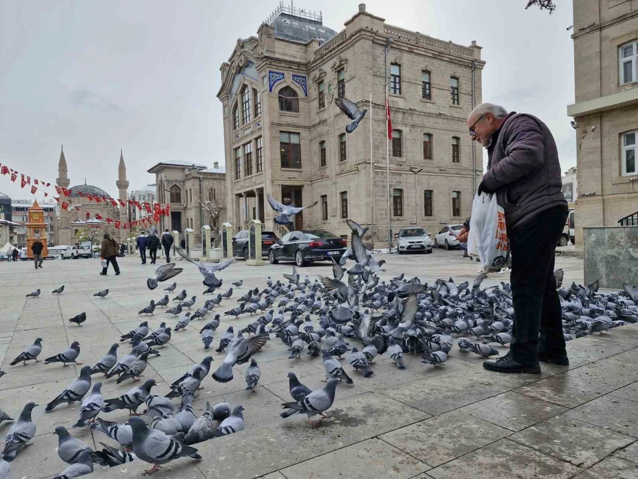 Aksaray’da yoğun kar yağışı ve hava sıcaklıklarının eksi 8 ile 10 derecelere kadar düşmesinin ardından olağan hayatta birçok aksamalar yaşanırken, hayvanlarında yiyecek bulması da bir hayli zorlaştı. 15 Temmuz Milli İrade Meydanında toplanan güvercinlerin soğuk havada yiyecek bulamadığını fark eden emekli öğretmen Caner Tekeli (66), arpa ve buğday alarak tekrar meydana geldi. Aldığı yem ile kuşları besleyen emekli öğretmen Tekeli, çarşıda işleri olduğunu, onları halledip evine giderken meydanda kuşların yiyecek arayışının dikkatini çektiğini anlatarak, "Normalde burada yem satan kardeşlerimiz olurdu, onlardan yem alıp sürekli kuşları besleyen vatandaşlarımız olurdu. Kuşların bu durumu birden dikkatimi çekti. Evime yaptığım alışverişten onlar da nasibini alsın diyerek aktardan onlara yem aldım. Her yer kar her yer betonken onların aç kalmasına gönlüm razı gelmedi, onları besledim" dedi.