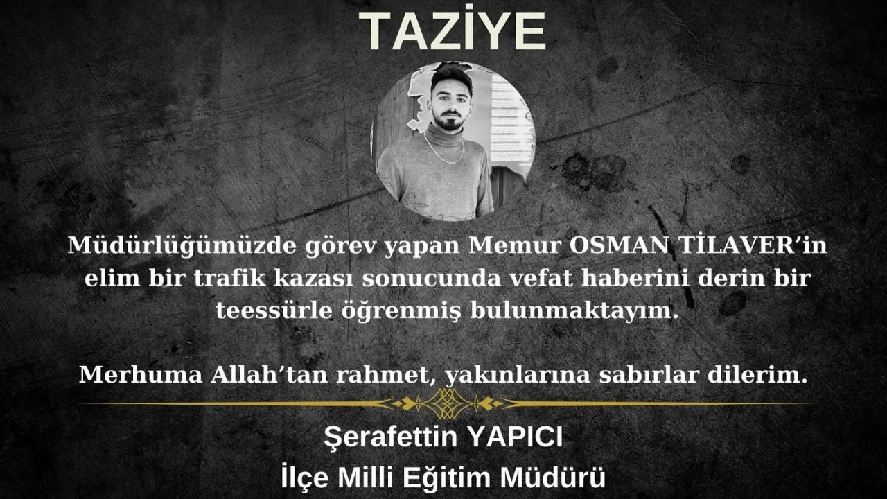 Aydın’ın Söke’de ilçesinde memur olarak görev yapan 24 yaşındaki Osman Tilaver, geçirdiği trafik kazasında hayatını kaybetti. Söke İlçe Milli Eğitim Müdürlüğü’nde memur olarak çalışan Osman Tilaver (24), gece yarısı geçirdiği trafik kazası sonucu hayatını kaybetti. Genç yaşta yaşamını yitiren Tilaver’in ölümü ailesi, sevenleri ve ilçedeki eğitim camiasını yasa boğdu. Söke İlçe Milli Eğitim Müdürü Şerafettin Yapıcı adıyla yayınlanan taziye mesajında "Müdürlüğümüzde görev yapan memur Osman Tilaver’in elim bir trafik kazası sonucunda vefat haberini derin bir teessürle öğrenmiş bulunmaktayım. Merhuma Allah’tan rahmet, yakınlarına sabır dilerim" ifadeleri yer aldı.