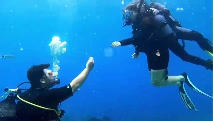Muğla’nın Bodrum ilçesinde yaşamını sürdüren Kemal Aslan, kız arkadaşı Dara Karadağ’a su altında evlilik teklifi yaptı.