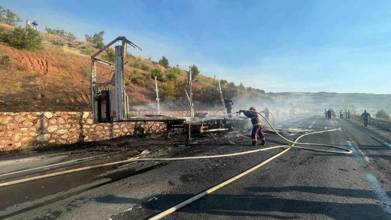 Bilecik’in Osmaneli ilçesinde sunta yüklü tırın dorsesi alev alev yandı.