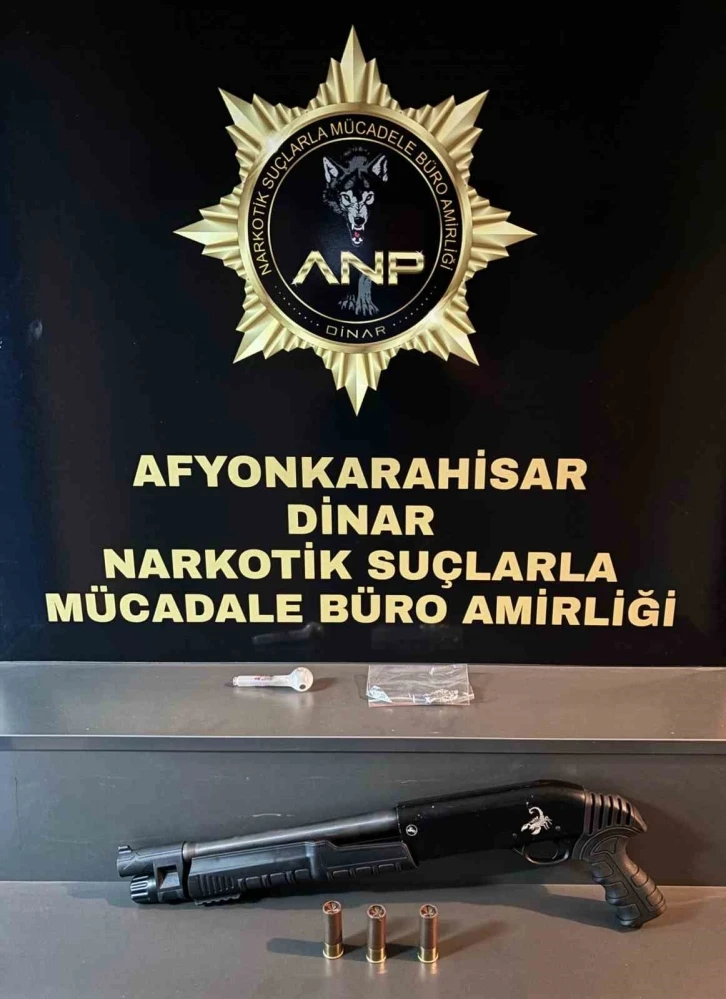 Edinilen bilgilere göre, Dinar İlçe Emniyet Müdürlüğüne bağlı Dinar Narkotik Suçlarla Mücadele Büro Amirliğine bağlı ekipler yaptıkları yol uygulamasında şüphe üzerine bir aracı durdurarak arama yaptı. Aramada 1.60 gram metamfetamin, 1 adet pompalı tüfek ve tüfeğe ait 3 adet dolu mermi ve 1 adet katlanabilir jop ele geçirdi. Olay sonrası araçta bulunan H.A., M.K.K ve S.K., isimli şahısların gözaltın alındığı bildirildi.