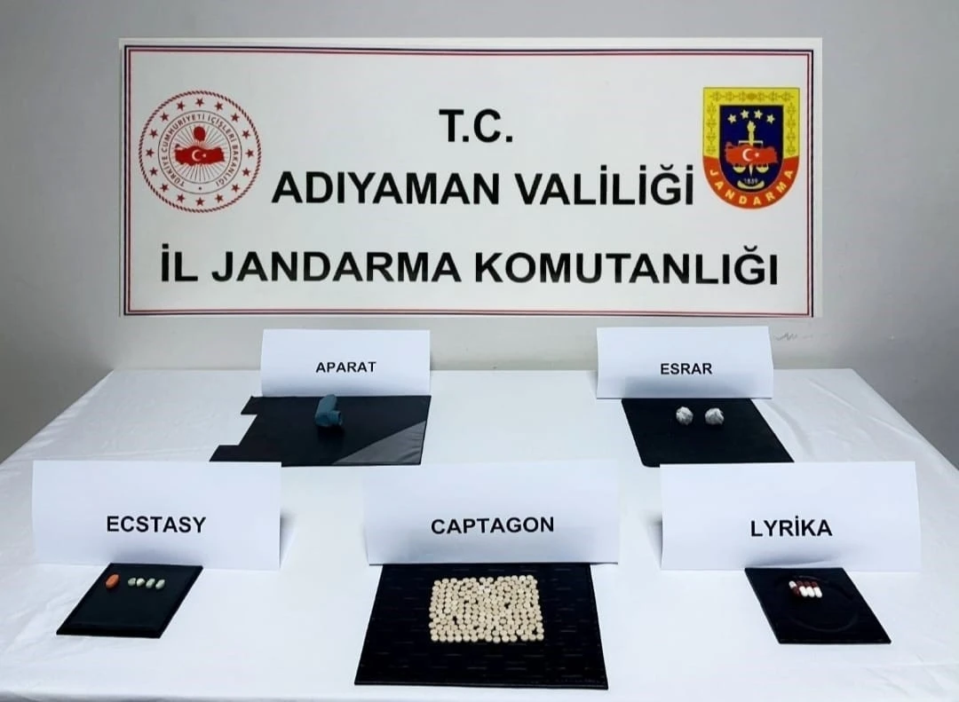 Adıyaman İl Jandarma Komutanlığı unsurlarınca yapılan çalışmalar sonucunda durumundan şüphelenilen M.C.A. isimli şahsın üzerinde ve aracında yapılan aramada 180 adet captagon sentetik uyuşturucu hap, 5 adet lyrica uyuşturucu hap, 5 adet ecstacy uyuşturucu hap ve 1 adet uyuşturucu kullanma aparatı ele geçirildi. Uyuşturucu haplar muhafaza altına alınırken şahıs ise gözaltına alınarak jandarma komutanlığına götürüldü.