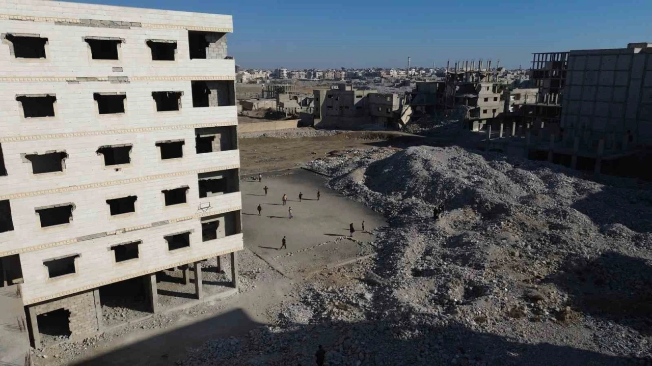 Suriye’de rejimin bombardımanlarında enkaza dönen yerleşim bölgesinde çocuklar, molozlardan temizledikleri sahada futbol oynayarak eğleniyor.
