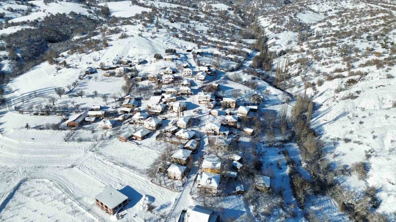 Bolu’nun Göynük ilçesine bağlı Karafakılar köyü, kar yağışının ardından beyaz örtüyle kaplandı. Havadan görüntülenen köyde, karlar altındaki evler ve cami kartpostallık manzaralar oluşturdu.