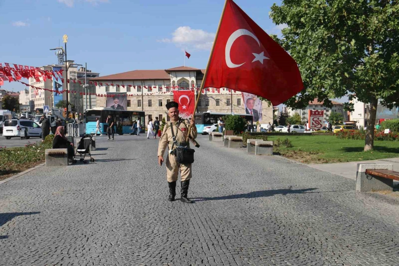 Sivas’ta milli gün ve haftalarda tarihi yansıtan kıyafetler giyen Nurettin Taşkın, ilgi odağı oluyor. Asker kıyafetleri giyerek dev sancak ile kentte gezen Taşkın, görenlerin dikkatini çekiyor.