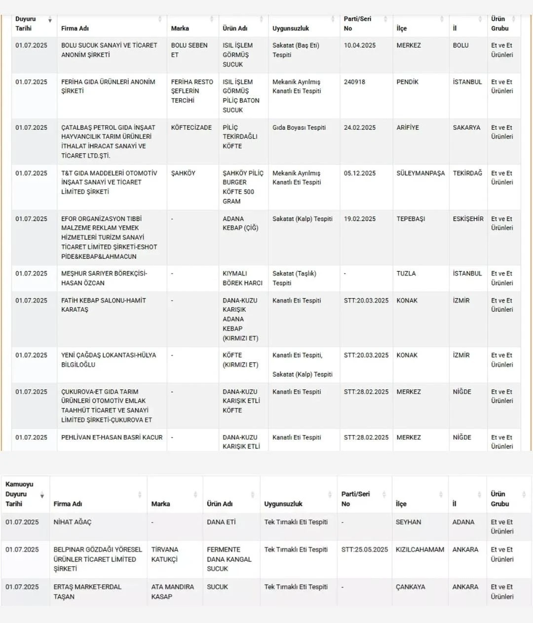 Açıklanan listede Niğde’de faaliyet gösteren Çukurova Et, Gıda Tarım Ürünleri ile Pehlivan Et isimli iş yerinde dana-kuzu karışık etli köftesinde kanatlı eti tespit edildiği ifşa edildi.