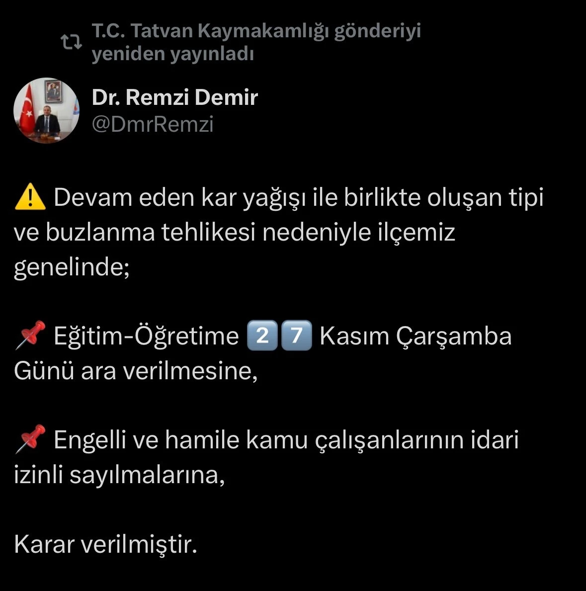 Bitlis’in Tatvan ilçesinde etkili olan kar yağışı, tipi ve buzlanma nedeniyle eğitim-öğretime bir gün ara verildi. Tatvan Kaymakamlığından yapılan açıklamada, “Devam eden kar yağışı ile birlikte oluşan tipi ve buzlanma tehlikesi nedeniyle ilçemiz genelinde 27 Kasım Çarşamba günü eğitim-öğretime ara verilmesine, engelli ve hamile kamu çalışanlarının idari izinli sayılmalarına karar verilmiştir” denildi. Olumsuz hava koşulları nedeniyle vatandaşların dikkatli olması ve gerekli tedbirleri alması istendi.