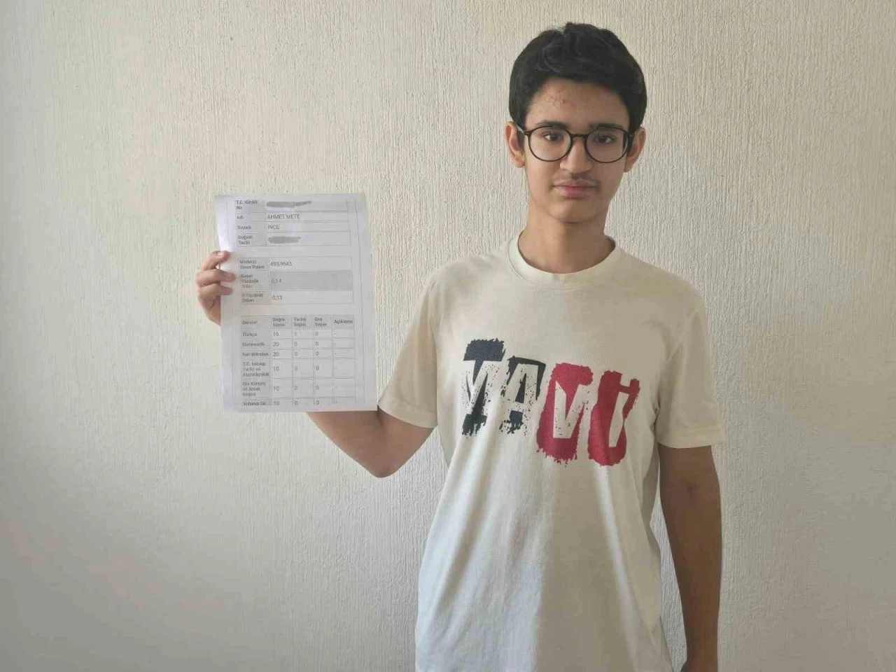 Ahmet Mete İnce, 493.9643 puan alarak Sarıgöl ilçe birincisi olurken, bu puanla ilçede bugüne kadar ulaşılan en yüksek başarıya imza attı. Tek yanlışa rağmen üst düzey bir sıralama elde eden başarılı öğrenci, hedefi olan Fen Lisesi’ne yerleşmeyi planlıyor.