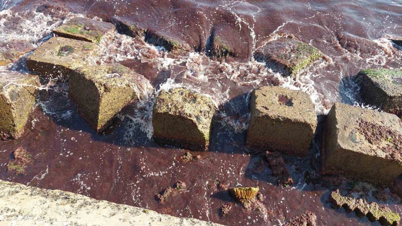Marmara Denizi’nin Tekirdağ kıyıları, lodosun getirdiği kızıl yosunlarla adeta kızıla boyandı.