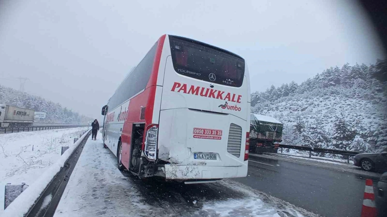 Kaza, TEM Otoyolu’nun Köroğlu rampaları mevkiinde meydana geldi. Edinilen bilgiye göre, İstanbul istikametinde seyreden hafif ticari araç kar nedeniyle kayganlaşan yolda önünde giden yolcu otobüsüne çarptı. Kazanın ardından aynı istikamette giden otomobil önündeki tıra çarptı. Aynı bölgedeki üçüncü kazada ise otomobil kayarak kamyona arkadan çarptı. Durum 112 Acil Çağrı Merkezi’ne bildirildi. İhbar üzerine bölgeye sağlık ve jandarma ekipleri sevk edildi. Kazada 6 araç hasar görürken 1 kişi hafif şekilde yaralandı. Kaza nedeniyle TEM’de ulaşım bir süre kontrollü şekilde sağlandı.
