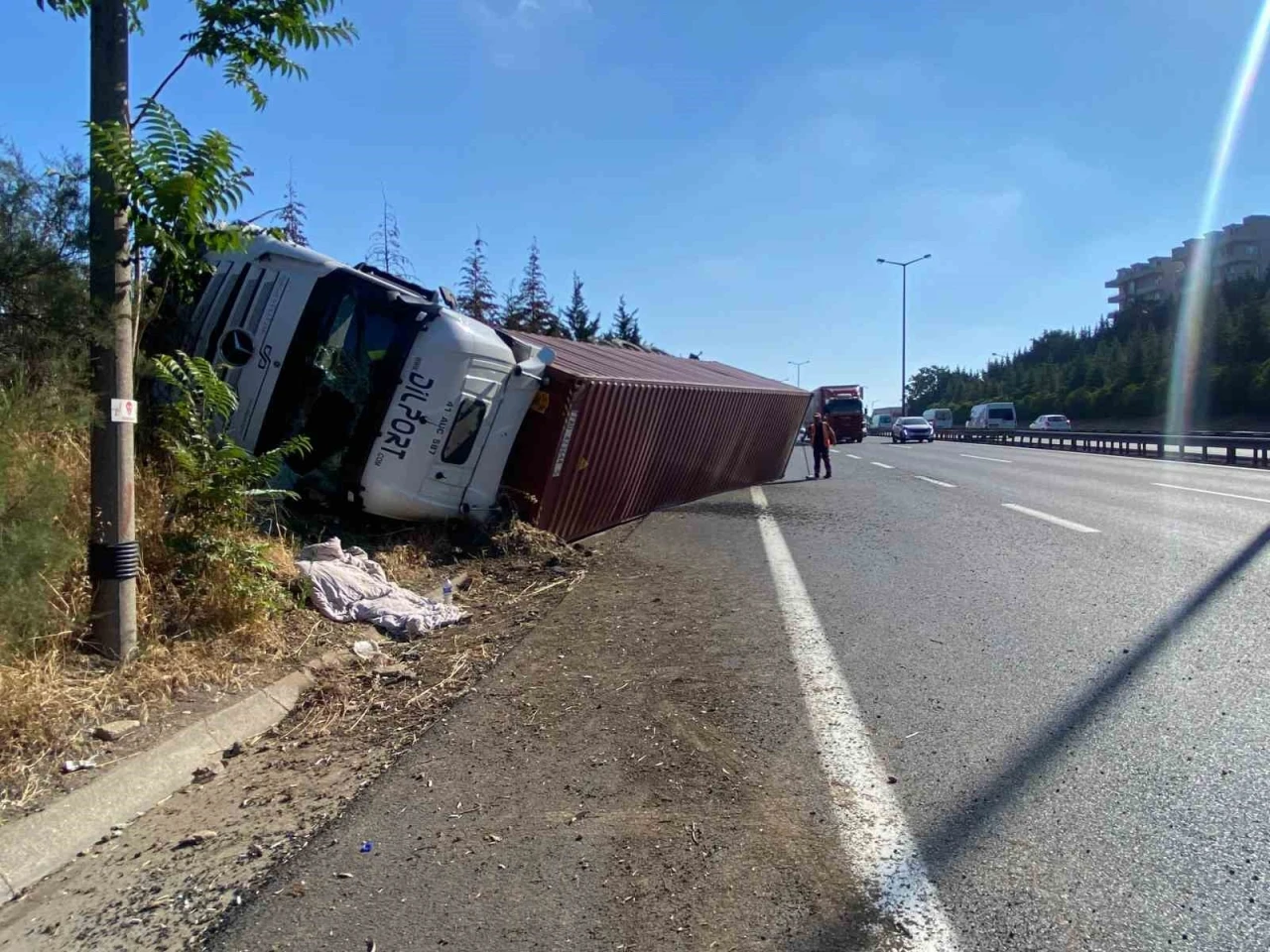 Kocaeli’nin İzmit ilçesi TEM otoyolu geçişinde konteyner yüklü tır devrildi. Sürücü kazayı hafif sıyrıklarla atlattı.