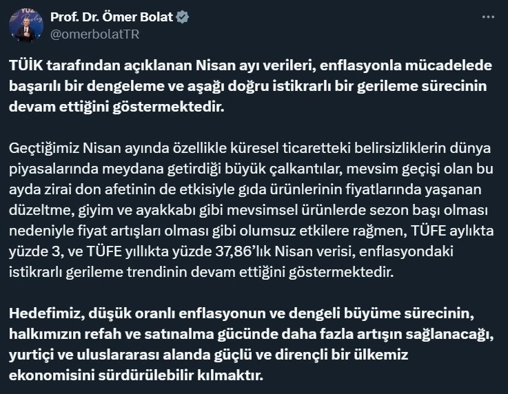 Ticaret Bakanı Ömer Bolat, "TÜFE aylıkta yüzde 3, TÜFE yıllıkta yüzde 37,86’lık Nisan verisi, enflasyondaki istikrarlı gerileme trendinin devam ettiğini göstermektedir" dedi.