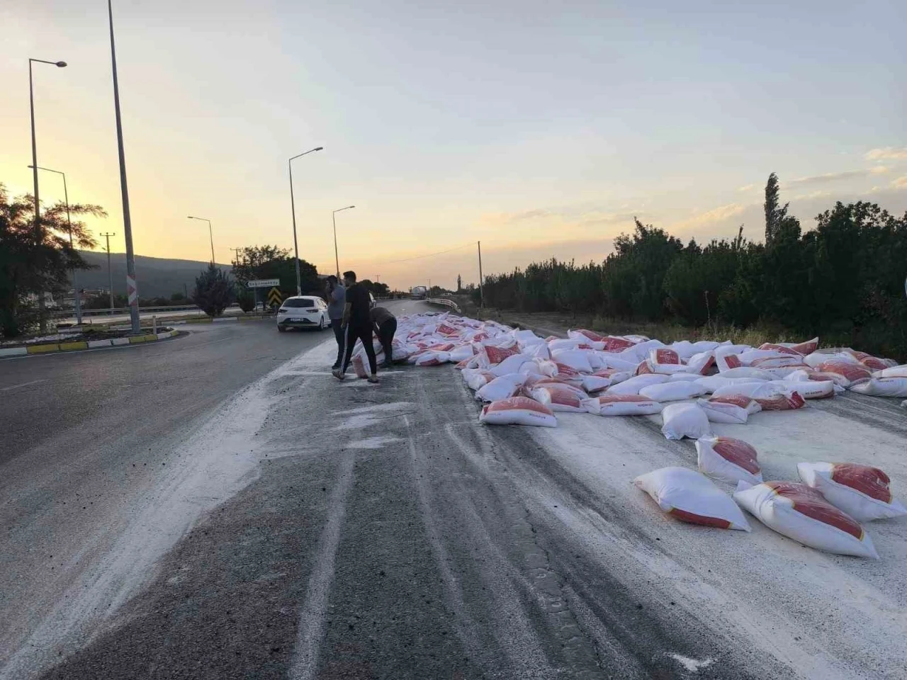 Konya’nın Akşehir ilçesi yakınlarında meydana gelen kazada, un yüklü bir tırın lastiğinin patlaması sonucu araç kontrolden çıkarken, dorsedeki un çuvalları yola savruldu.