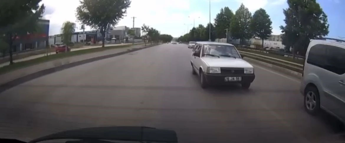 Bursa’nın Osmangazi ilçesi İzmir Yolu Caddesi üzerinde ilerleyen TOFAŞ marka bir otomobilin sürücü iki aracın arasından geçmek isteyince gaza yüklendi. Makas atarak giden otomobil kazayı teğet geçince, diğer sürücüler korna çalarak tepki gösterdi. Ölümüne makas atan sürücü ise araç içi kamerasıyla saniye saniye görüntülendi.