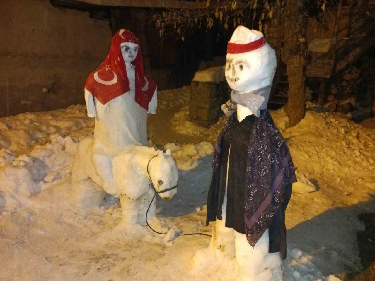 Erzurum’un Oltu ilçesinde Muhtar, İsmail Altaş, torununu mutlu etmek için kardan gelin, damat ve at heykeli yaptı.
