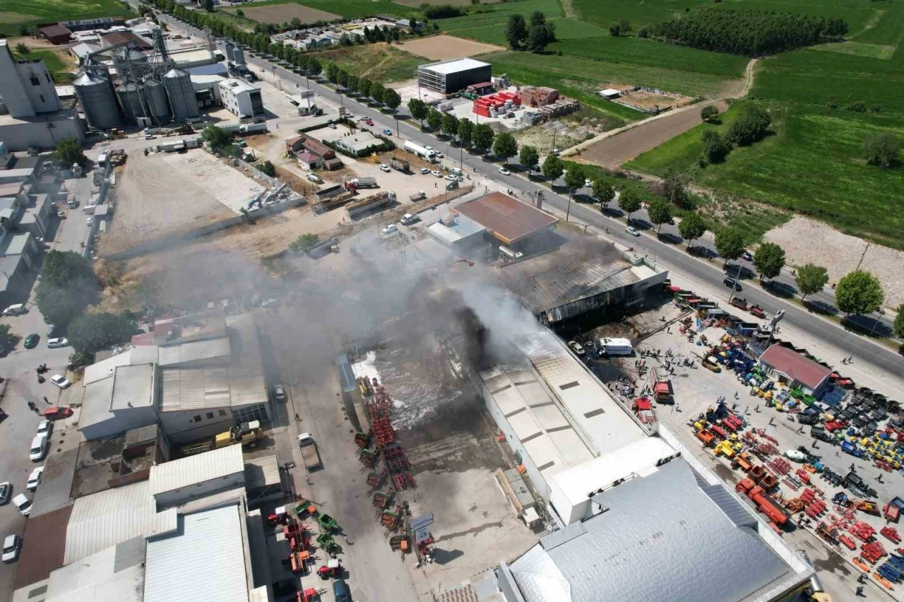 Sakarya’nın Adapazarı ilçesinde bulunan Zirai Aletler Sanayi Sitesi içindeki traktör bayisinin deposunda çıkan yangın ve söndürme çalışmaları havadan görüntülendi.