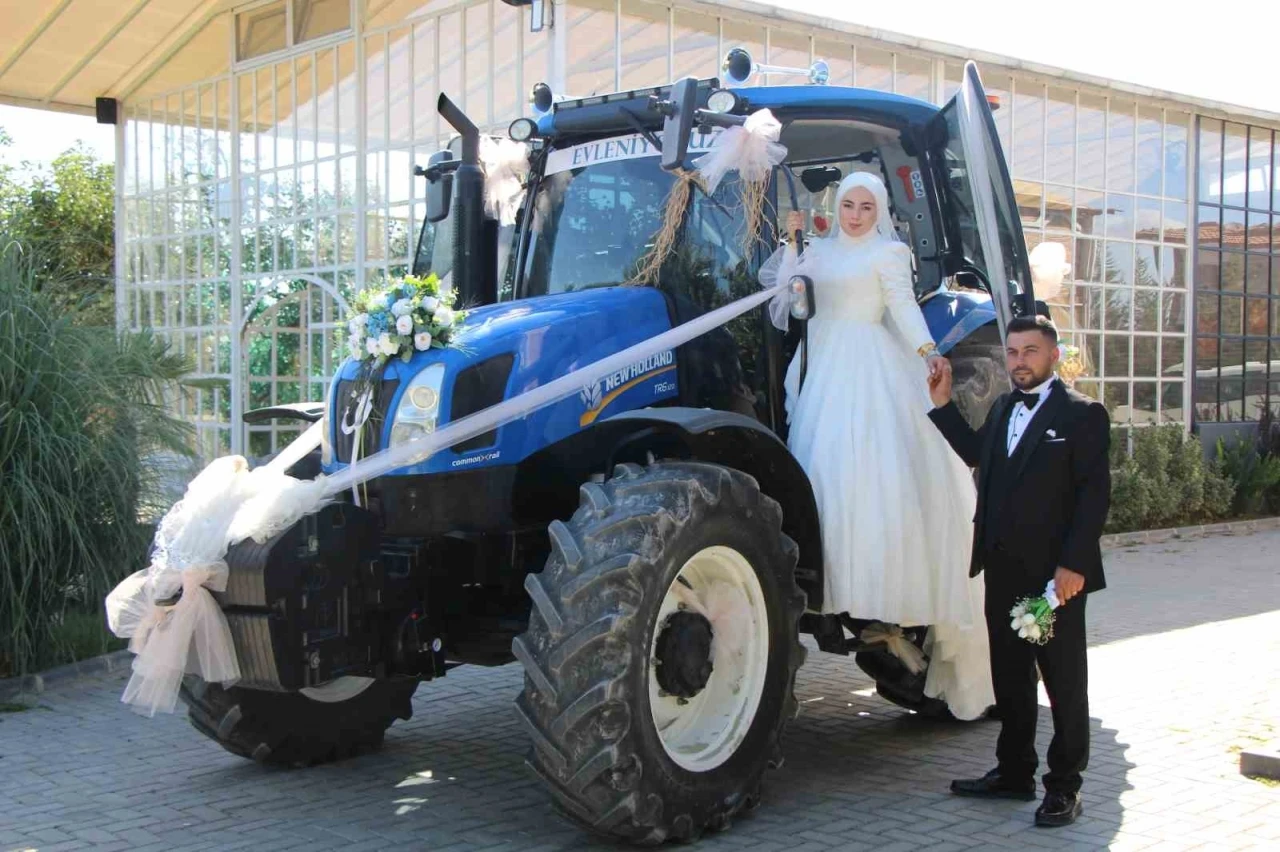 Çiftçi Büşra Yaman (21) ile kepçe operatörü Emrullah Satılmış (23) dillere desten düğünleri öncesi düğün arabası olarak traktörlerini kullanmaya karar verdi. Traktörü süsleyen çift, daha sonra ilçede traktörle dolaştı. Çiftin arkadaşları da konvoya katıldı. Gelinin direksiyon başına geçmesi ise renkli görüntülere sahne oldu.