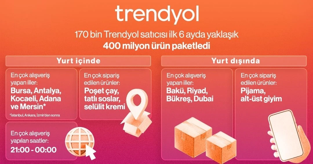 Trendyol, 2025 yılının ilk yarısının Türkiye Alışveriş Haritasını paylaştı. Bu dönemde 170 bin satıcının yaklaşık 400 milyon ürünü, Trendyol aracılığıyla tüketicilerle buluştu. Trendyol, Ocak-Haziran 2025 dönemine ait e-ticaret ve e-ihracat eğilimlerini paylaştı. 2025 yılının ilk yarısında Trendyol’da faaliyet gösteren 170 bin satıcı, yaklaşık 400 milyon ürünü tüketicilerle buluşturdu. En çok alışveriş yapılan iller İstanbul, Ankara, İzmir, Bursa, Antalya, Kocaeli, Adana ve Mersin olurken; en çok satış yapan iller İstanbul, Ankara, İzmir, Kocaeli, Bursa, Gaziantep ve Adana olarak öne çıktı. Alışverişte her bölgenin favorisi farklı