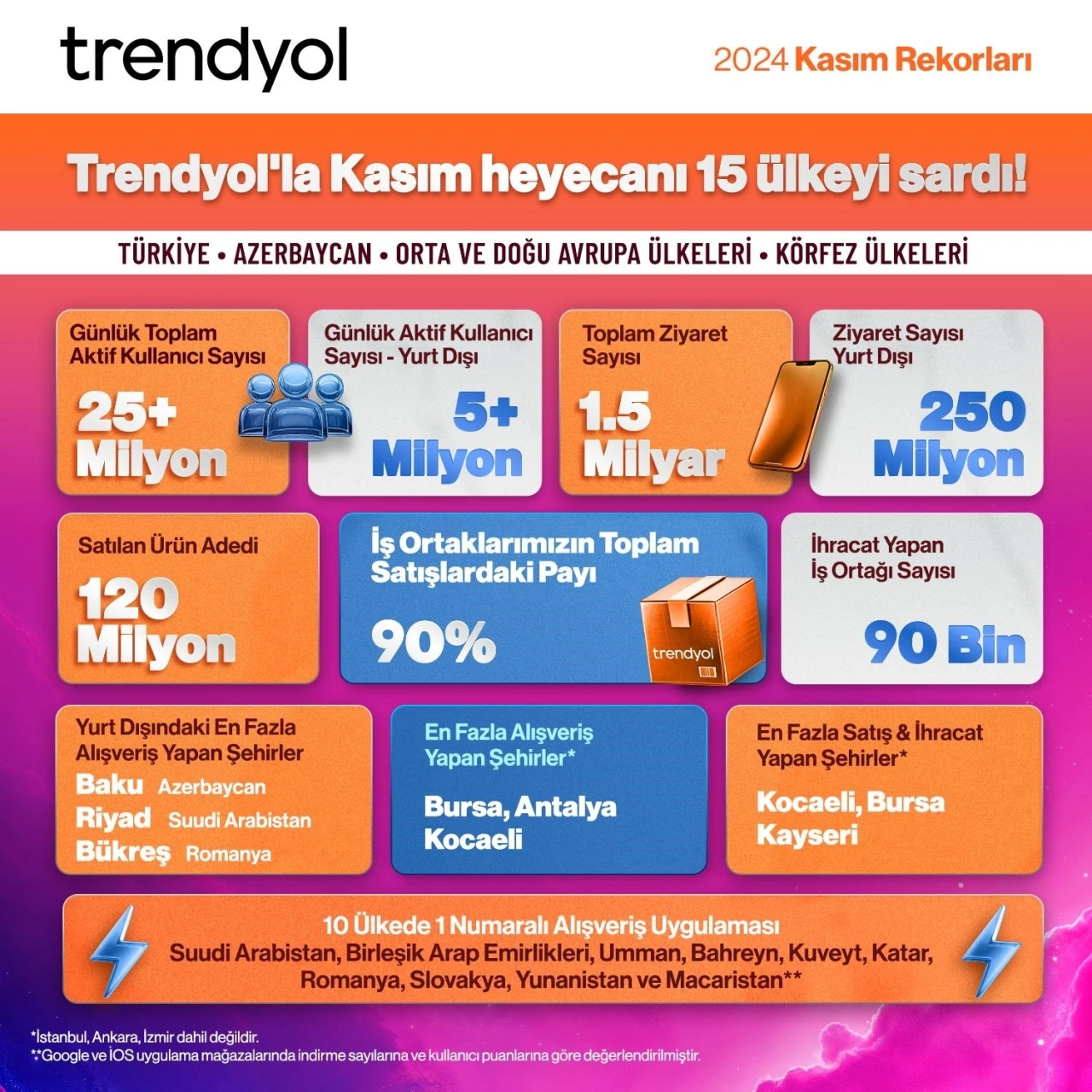 Dünyanın önde gelen e-ticaret platformlarından Trendyol kasım kampanyalarını bu yıl ilk kez eş zamanlı olarak 15 ülkede birden gerçekleştirdi. Böylece 90 bin satıcının ürününü yurt dışındaki Trendyol kullanıcılarıyla buluşturdu. Trendyol bu dönemde yurt dışından 250 milyon ziyaret aldı ve 10 ülkede de en çok indirilen uygulama oldu. Trendyol bu yıl Süper Alışveriş Günleri ve Efsane Günler kasım kampanyalarını Türkiye ile birlikte, Azerbaycan, Suudi Arabistan, Birleşik Arap Emirlikleri, Katar, Kuveyt, Bahreyn, Umman, Almanya, Avusturya, Romanya, Yunanistan, Macaristan, Çekya ve Slovakya’da aynı anda yürüttü. Böylece kasım kampanyalarıyla oluşan e-ticaret ve mikro ihracat hacmiyle Trendyol satıcılarının işlerini Türkiye’nin yanı sıra yurt dışı pazarlarda da büyütmesini sağladı. Trendyol ayrıca kampanya süresi boyunca pazarlama ve lojistikten, avantajlı finansman erişimine pek çok desteği de iş ortaklarına sundu. Kasım kampanyası sırasında 25 milyon günlük aktif kullanıcı sayısına ulaşan Trendyol’un, kampanya süresince e-ihracat yapan satıcı sayısı 90 bine ulaştı. Trendyol Kasım ayında 250 milyon kez yurt dışı ziyareti aldı. Yurt dışı pazarların gözdesi ‘saklama kabı’