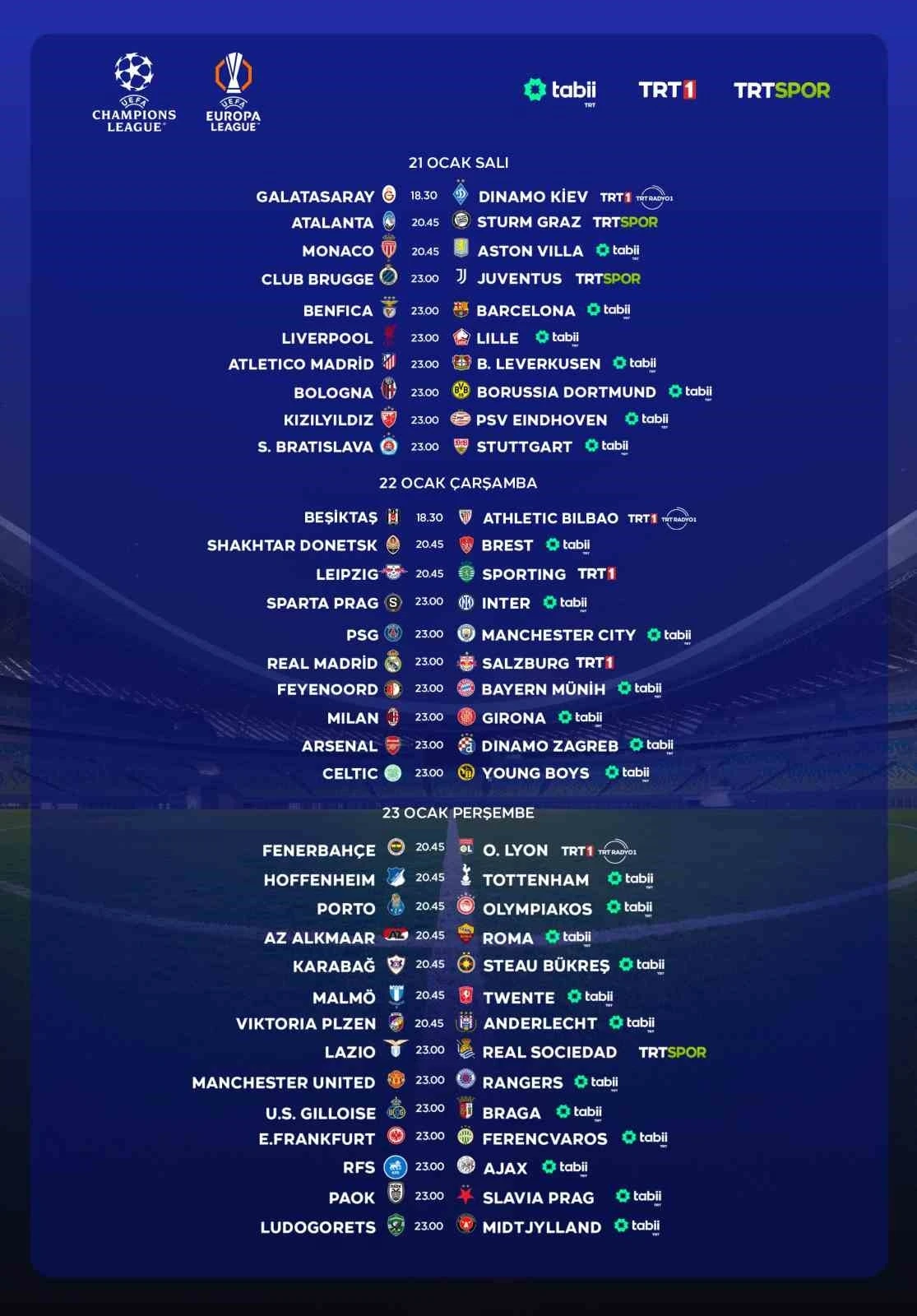 UEFA Şampiyonlar ve Avrupa Ligi’nde 21, 22 ve 23 Ocak tarihlerinde oynanacak 34 karşılaşma canlı yayınla TRT 1, TRT Spor, TRT Radyo 1 ve tabii platformundan futbolseverlerle buluşacak.