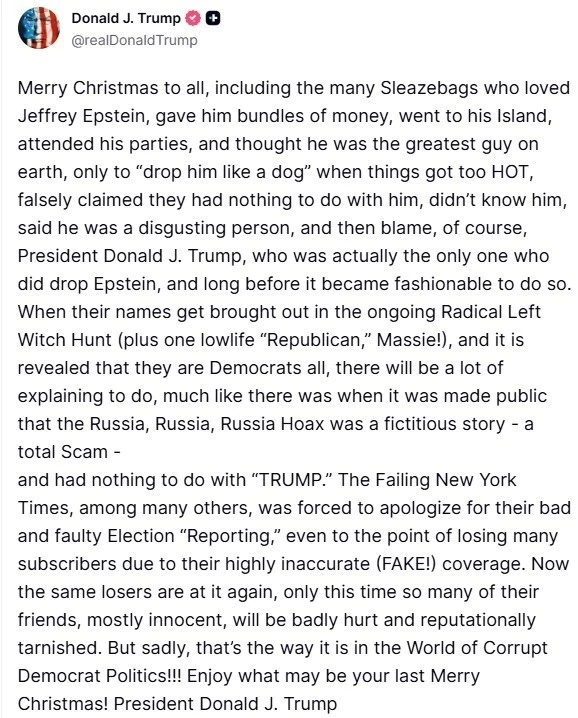 ABD basınını da Epstein belgeleri konusundaki tutumu nedeniyle eleştiren Trump, New York Times gazetesi dahil birçok "başarısız" basın kuruluşunun hatalı seçim haberleri için özür dilemek zorunda kaldığını ya da abone kaybettiğini hatırlattı. Şimdi aynı hatanın Epstein belgeleri konusunda yapıldığını savunan Trump, "Ancak bu sefer çoğu masum olan birçok arkadaşları ciddi şekilde zarar görecek ve itibarları zedelenecek. Ama ne yazık ki, yozlaşmış Demokrat siyaset dünyasında işler böyle yürüyor" dedi. Trump, "Belki de son mutlu Noeliniz olacak bugünün tadını çıkarın" ifadelerini kullandı.