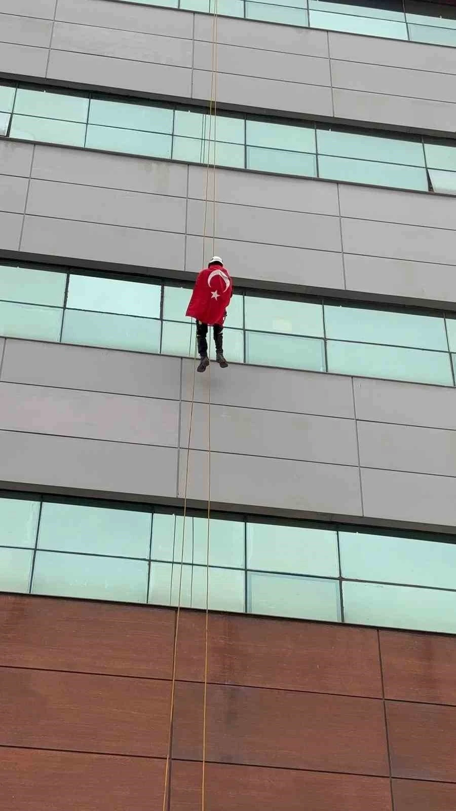 Aydın’ın Efeler ilçesinde endüstriyel iple erişim uzmanı Barış Özbey, Nusaybin-Kamışlı sınır hattında Türk bayrağına yönelik YPG terör örgütü yandaşları tarafından gerçekleştirilen saldırıya tepki göstermek amacıyla Türk Bayrağı ile yaklaşık 5 kat yüksekliğe tırmanarak bayrağı zirveye astı. Mardin’in Nusaybin ilçesinde sınır hattında dikili bulunan Türk Bayrağı’nın terör örgütü yandaşları tarafından indirilmesi, Türkiye genelinde büyük tepki topladı. Saldırıya bireysel bir duruşla tepki gösteren endüstriyel iple erişim uzmanı Barış Özbey, Türk Bayrağı ile yaklaşık 30 metre yüksekliğindeki 5’inci kata tırmanarak bayrağı binanın en üst noktasına astı. Özbey, "Mardin’in Nusaybin ilçesinde yaşanan alçak saldırıya tepki göstermek adına böyle bir şey yaptım. Yaklaşık 30 metre tırmanarak şanlı Türk Bayrağımızı zirveye astım. Bu saldırıyı şiddetle lanetliyorum" ifadelerini kullandı.