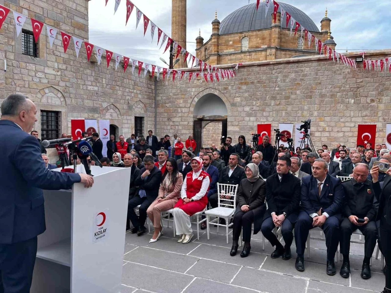 Türk Kızılay, Nevşehir Valiliği ve Vakıflar Genel Müdürlüğü ile iş birliği ile Damat İbrahim Paşa Külliyesindeki Aşevi’nin açılışında konuşan Kızılay Genel Başkan Prof. Dr. Fatma Meriç Yılmaz, "Aşevleri bizim için 2025 yılında strateji planımızda en öne koyduğumuz projelerimizin başında geliyor. Türk Kızılay herhangi bir afet durumunda kapasitesini harekete geçirebilecek alt yapısını genişletmeye devam ediyor. Kültür ve geleneklerimizde aşevi insanların bir araya gelerek adak kurbanlarını kestiği, çiftçilerin öşür verdiği bir merkez konumundadır. 81 ilde ki tüm şubelerimizin her birine aşevi açmayı hedefliyoruz. Toplumumuzun yaşı artıyor. Bir taraftan sağlık sistemimiz ileri düzeyde ve uzun yaşıyoruz. Bu çerçevede aşevlerini büyüklerimizin kapısını çalma şeklinde konumlandırıyoruz. Aşevleri bizim alan el ile veren el arasında iyilik köprümüzdür. Aşevleri çiftçilerimizin öşürlerini getirip emanet edebilecekleri, adak kurbanlarını emanet edebilecekleri yerlerdir. Aslında aşevleri bizler için öbür dünyamıza yapacağımız yatırımdır. Her aşevimiz bu kadar güzel ve tarihi mekanda olmuyor. 46. sını açtığımız aşevinin hayırlı olmasını diliyorum" dedi.
