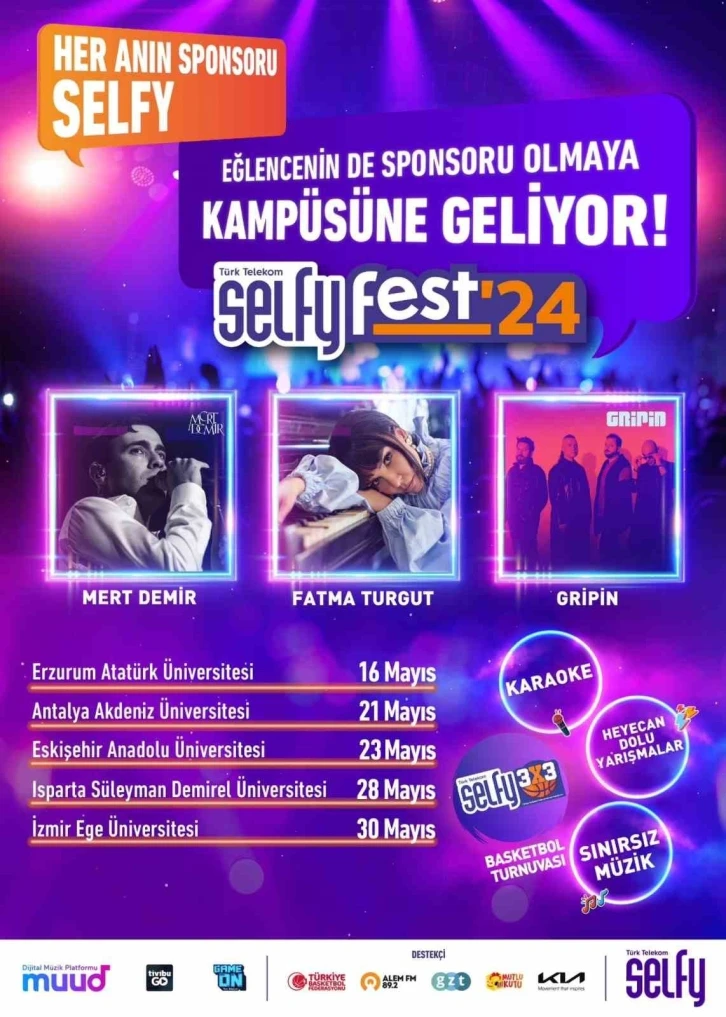 Türk Telekom’un gençlik markası Selfy, özgür ve keyifli dünyasını müzik ve sporla üniversite kampüslerine taşıyor. ‘Her Anın Sponsoru Selfy Kampüste’ konseptiyle 16-30 Mayıs tarihleri arasında üniversitelerde; konserler, Selfy3X3 Basketbol Turnuvası, çeşitli yarışmalar ve birbirinden renkli aktiviteler düzenlenecek. Türk Telekom’un gençlik markası Selfy, birbirinden özel etkinlikleri öğrencilerle buluşturmayı sürdürüyor. ‘Her Anın Sponsoru Selfy Kampüste’ konseptiyle düzenlenen Türk Telekom Selfy Fest’24; bu yıl 16-30 Mayıs tarihleri arasında Erzurum, Antalya, Eskişehir, Isparta ve İzmir’de gerçekleştirilecek. Festival kapsamında; Mert Demir, Fatma Turgut ve Gripin sevilen şarkılarını üniversitelilerle birlikte seslendirecek. Festivalde DJ performanslarının yanı sıra, üniversite kulüplerinin müzik grupları da ana sahnede performanslarını sergileme fırsatı yakalayacak. Yüz binlerce öğrencinin katılacağı festival, konserler, basketbol müsabakaları, oyun turnuvaları, sürpriz hediyeli yarışmalar ve birbirinden heyecanlı aktivitelere sahne olacak. Üniversitelerin en iyi basketbolcuları Selfy3X3’te sahne alacak