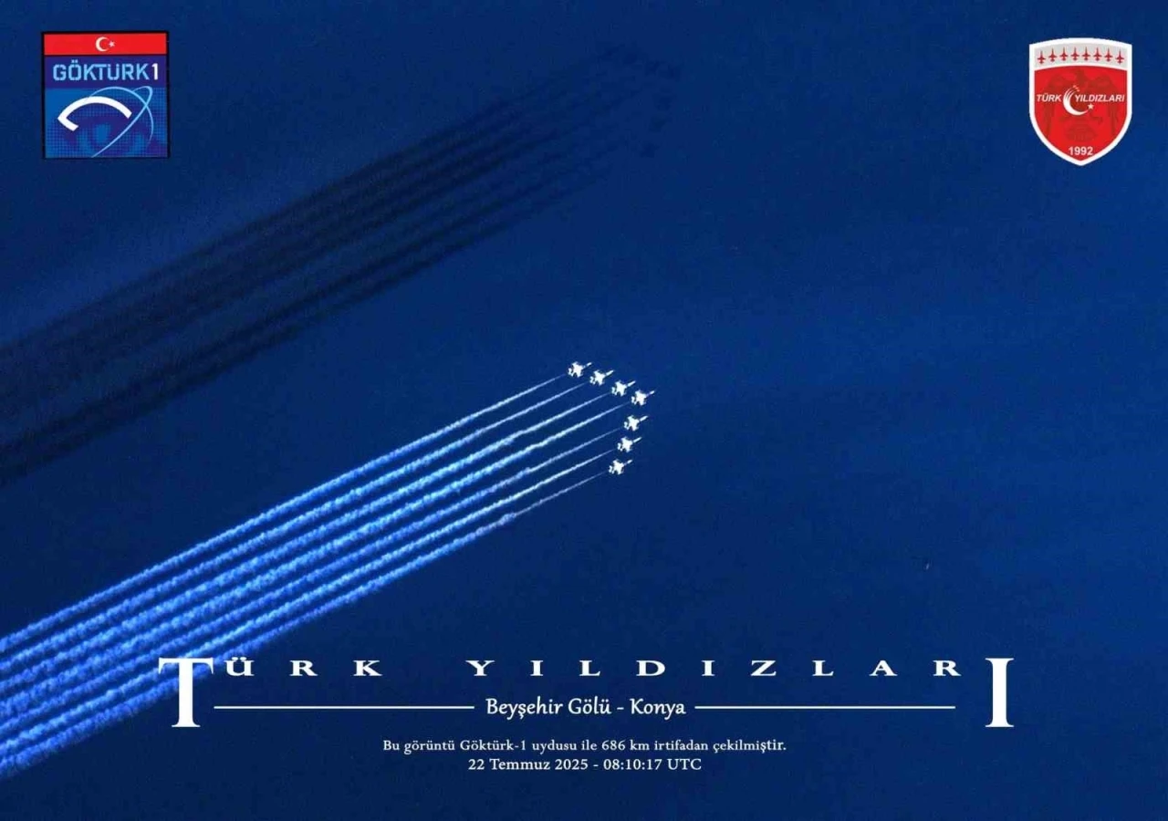 Türk Yıldızları tarafından yapılan sosyal medya paylaşımında, "Göktürk’ün gözünden. Beyşehir Gölü üzerinde 100 metre irtifada 740 km/saat hızla yaptığımız uçuş, 686 km yükseklikten 7,5 km/saniye hızla dönen uydumuz tarafından ölümsüzleştirildi" ifadelerini yer verildi.