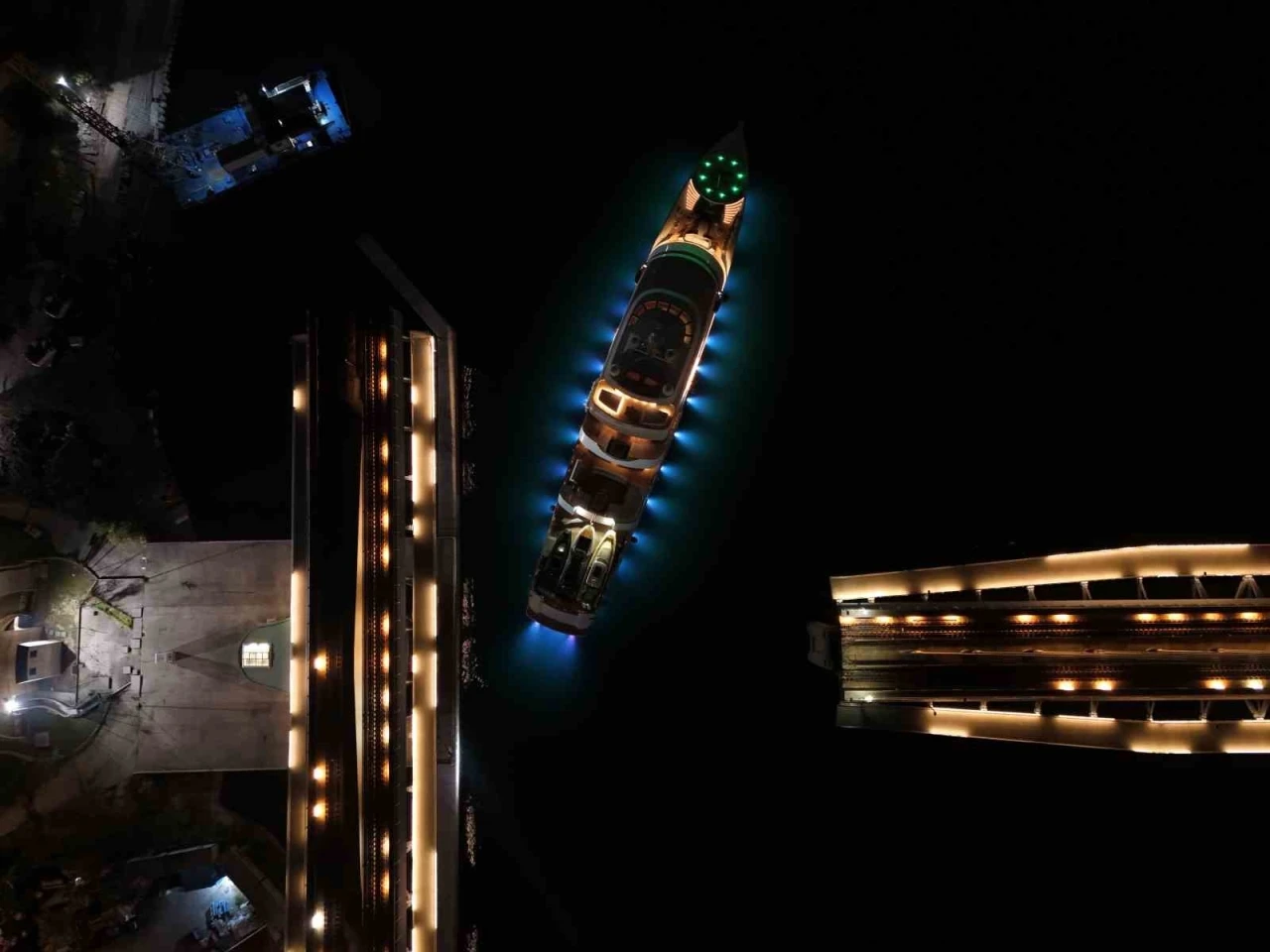 Türkiye’de üretilen en büyük mega yat olma özelliği taşıyan Victorious Haliç’e geldi. 85 metre uzunluğunda 125 milyon Euro değerindeki ultra lüks yatın haliçte açılan köprülerden geçme anları havadan görüntülendi.