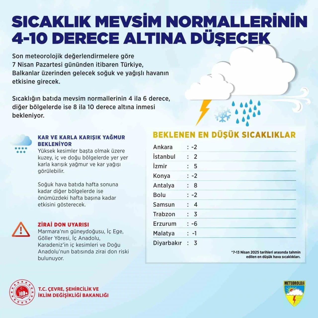 Ankara -2, İstanbul 2, İzmir 5, Konya -2, Antalya 8, Bolu -2, Samsun 4, Trabzon 3, Erzurum -6, Malatya -1, Diyarbakır 3 derece.