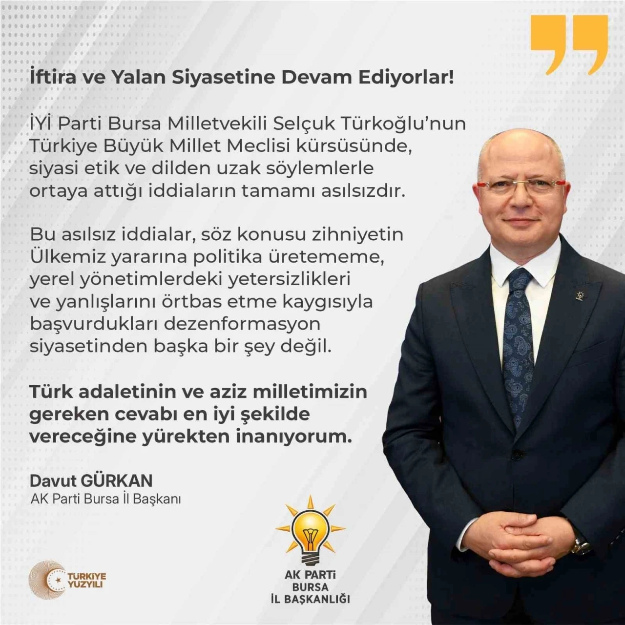 Bu iddialara cevap veren AK Parti Bursa İl Başkanı Davut Gürkan Türkoğlu’nun iddialarının gerçeği yansıtmadığını ve tamamının asılsız olduğunu söyledi.