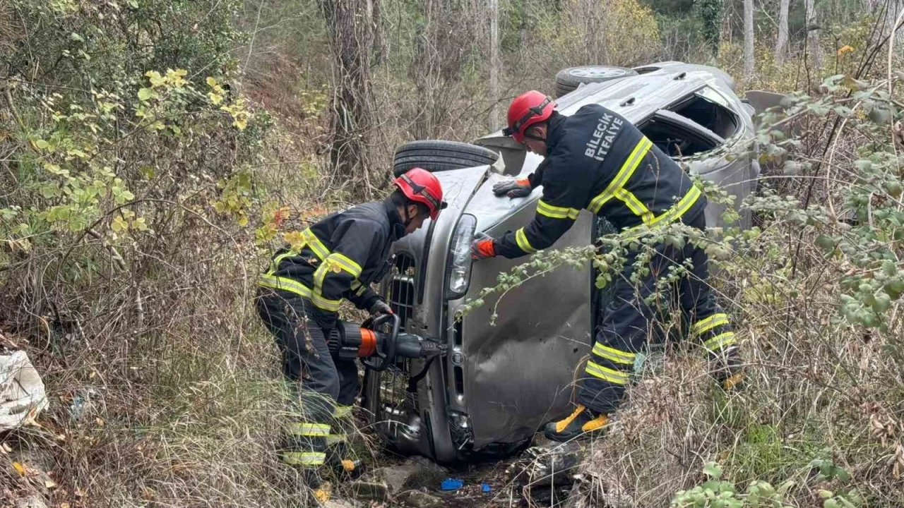 Bilecik’te seyir halinde frenleri tutmayıp uçuruma yuvarlanan hafif ticari aracın sürücüsü, kazayı burnu bile kanamadan atlattı.