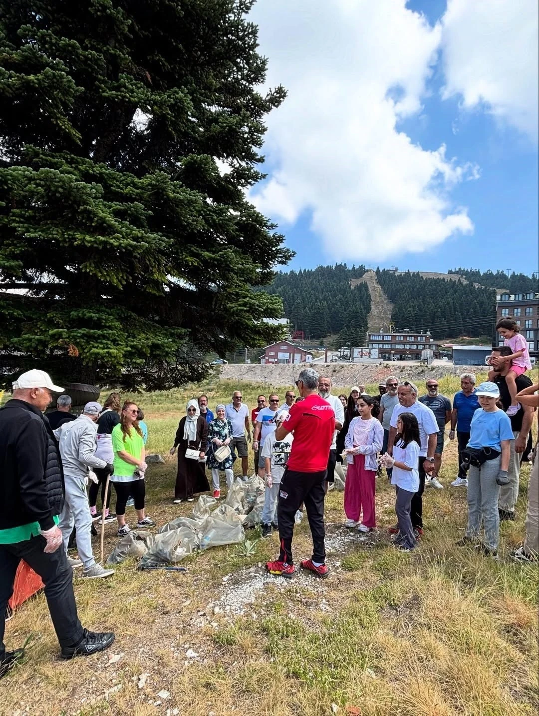 Uludağ’da yangın riskine karşı her taşın altını temizleyen kayak öğretmenleri ve aileleri, 30 poşet çöp ve 2 konteyner atık topladı.