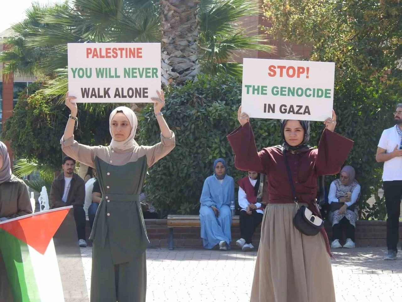 Filistin halkına yapılan zulmün tüm insanlığa yapılmış bir saldırı olduğunu belirten ve öğrenciler adına açıklama yapan Ali Anamur, "Siyonist işgalcileri destekleyen her türlü ürünün boykot edilmesini talep ediyoruz. Unutulmamalıdır ki Gazze’de yaşanan bu vahşet sadece Filistinlilere değil, tüm insanlığa yapılmış bir saldırıdır. Bizler Filistin halkının yanında olduğumuzu ve onların acılarını yüreklerimizde hissettiğimizi ilan ediyoruz" diye konuştu