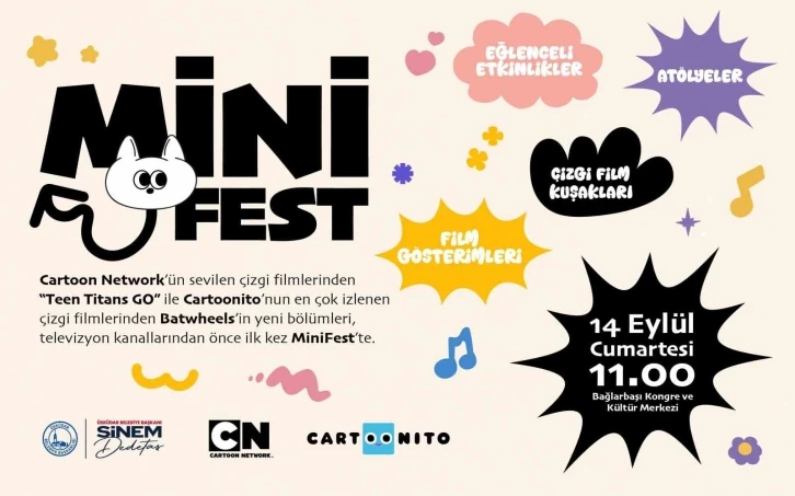 14 Eylül Cumartesi günü Bağlarbaşı Kongre ve Kültür Merkezi’nin avlusunda gerçekleşecek Mini Fest etkinliğinde çocuklar ve gençler için gün boyu atölyeler, film gösterimleri, çizgi film kuşağı, kostüm karakterler ile sosyalleşebilecekleri ve eğlenebilecekleri bir alan oluşturacak. Mini Fest kapsamında Cartoon Network & Cartoonito işbirliği ile Cartoon Network’te yayınlanan “Teen Titans GO” ve Cartoonito’da yayınlanan “Batwheels” çizgi filmlerinin yeni bölümlerden birer tane bölüm alanda gösterilecek. Çocuklar ve gençler tarafından çok sevilen “Kral Şakir” Mini Fest’te