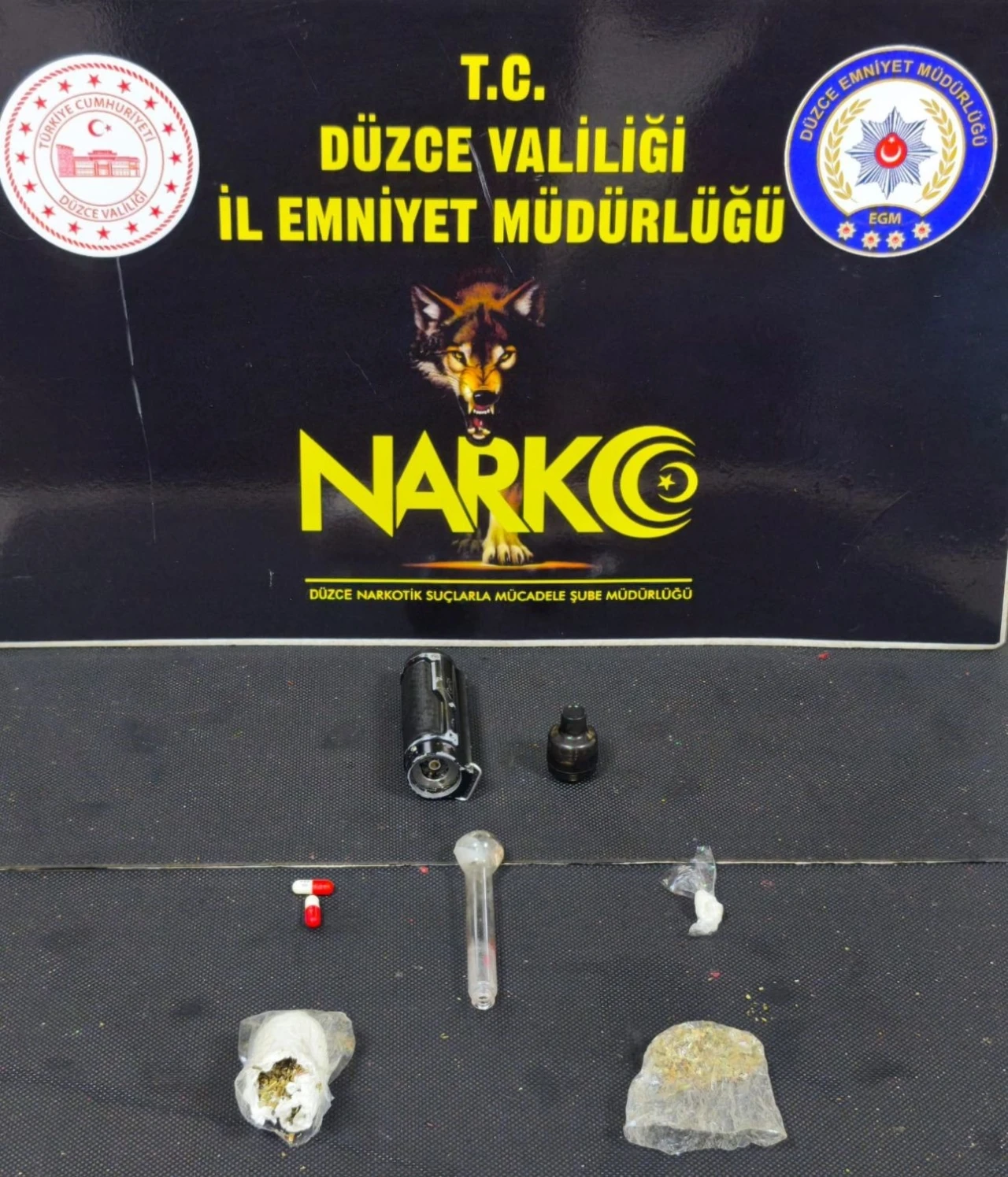 Düzce Cumhuriyet Başsavcılığı koordinesinde Narkotik Suçlarla Mücadele Şube Müdürlüğü ekiplerince Küçük Sanayi Sitesi içerisinde yapılan çalışmalarda; 5 gram sentetik kannabinoid, 2 adet sentetik ecza, elektronik sigara içerisinde 1 gram metamfetamin, 2 gram metamfetamin maddesi ile uyuşturucu madde kullanmaya yarayan aparat ele geçirildi.