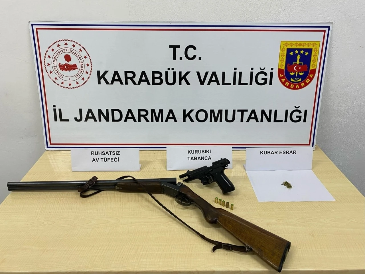 Safranbolu Cumhuriyet Başsavcılığı koordinesinde, İl Jandarma Komutanlığı ekipleri, durumundan şüphelenilen bir şahsı durdurdu. Şahsın üzerinde ve ikametinde yapılan aramada kuru sıkı tabanca, ruhsatsız av tüfeği ile 0,21 gram esrar ele geçirildi.