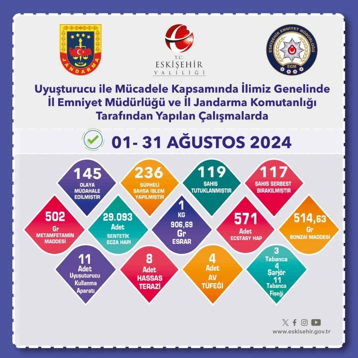 Edinilen bilgiye göre, Eskişehir İl Emniyet Müdürlüğü ve İl Jandarma Komutanlığı ekipleri tarafından uyuşturucu ile mücadele çerçevesinde çalışma gerçekleştirildi. İl genelinde 1-31 Ağustos 2024 tarihinde yapılan çalışmalarda 145 olaya müdahale edildi. Yapılan çalışmalar çerçevesinde işlem yapılan 236 şüpheliden 119’u tutuklanarak cezaevine gönderildi.