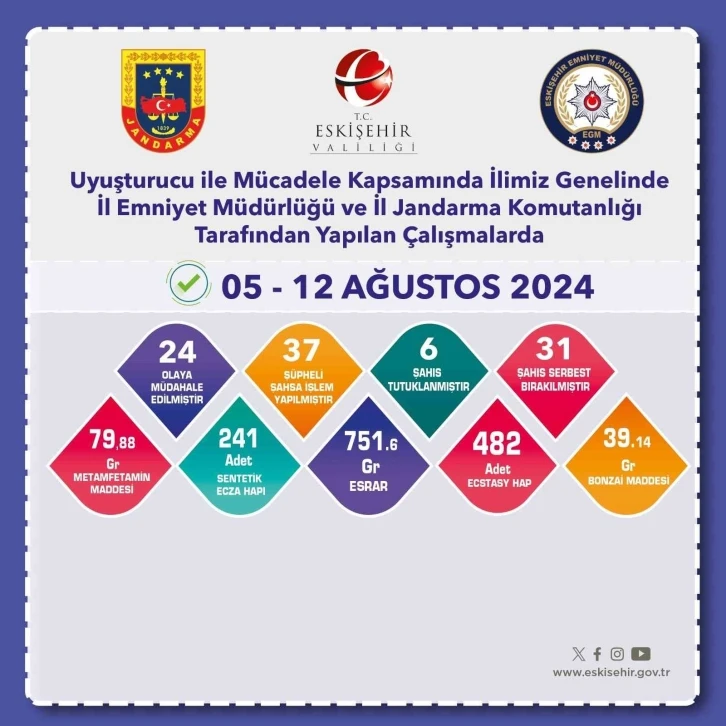 Edinilen bilgiye göre, İl Emniyet Müdürlüğü ve İl Jandarma Komutanlığı ekipleri tarafından uyuşturucu ile mücadele çerçevesinde çalışma yapıldı. Kent genelinde 5-12 Ağustos tarihleri arasında gerçekleştirilen çalışmalarda; 24 olaya müdahale edilip, 36 şahsa işlem yapılıp, 6 şüpheli tutuklandı ve 31 şahıs serbest bırakıldı. Ayrıca ekiplerce yapılan aramalarda; 79,88 gram metamfetamin, 241 adet sentetik ecza hapı, 751,6 gram esrar, 482 adet ecstasy hap ve 39,14 gram bonzai ele geçirildi.